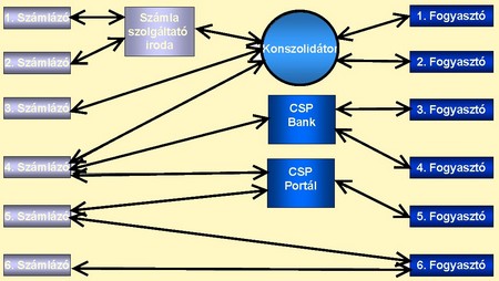 EBPP kapcsolatrendszer Az EBPP, mint korábban láttuk, nem más, mint egy összetett szerződéses kapcsolat a számlázók (telefontársaságok, gázszolgáltatók, stb.), a szolgáltató irodák, konszolidátorok (portálok, bankok), és az ügyfelek között. Az EBPP kapcsolatrendszerében 4 csoport különül el élesen: szolgáltatók, konszolidátorok, vállalati fogyasztók és lakossági fogyasztók. A konszolidátor fizikai létrehozására számos modell létezik, a három legfontosabb: 1. Nincs konszolidátor: a számlákat előállító cég készíti el a webes megjelenítést. 2. Vékony modell: ebben az esetben a konszolidátor csak a számlák kivonatát kapja meg, a részletes számlakivonat megjelenítést a számlázó vállalja. 3. Vastag modell: a számlázó cég a teljes számlaállományt a konszolidátor rendelkezésére bocsátja, és annak megjelenítését és a fizetéssel kapcsolatos teendőket is rábízza. A konszolidátor szerepe tulajdonképpen az EBPP folyamatban az, hogy a számlázó cégek válláról teljesen vagy részben levegye a számlamegjelenítés terhét és segítse a díjbeszedésben. Ráadásul a felhasználók a konszolidátorral kötött szerződés után, az összes számlájukat megtekinthetik egy helyen. Megnézhetik, hogy milyen fizetési kötelezettségei vannak az egyes szolgáltatók felé, folyószámla esetén pedig egyenlegét, az egyes tranzakciókat ellenőrizhetik. Természetesen a számlákkal kapcsolatos részletes adatok is hozzáférhetőek. Nemcsak a különböző számlázó cégek számláinak konszolidálására van lehetőség, hanem egy cégen belüli esetlegesen többféle számlázó rendszerből (pl.: lakossági, közületi számlázó rendszer, folyószámla kezelő rendszer) származó adatok konszolidálására is. Kép**